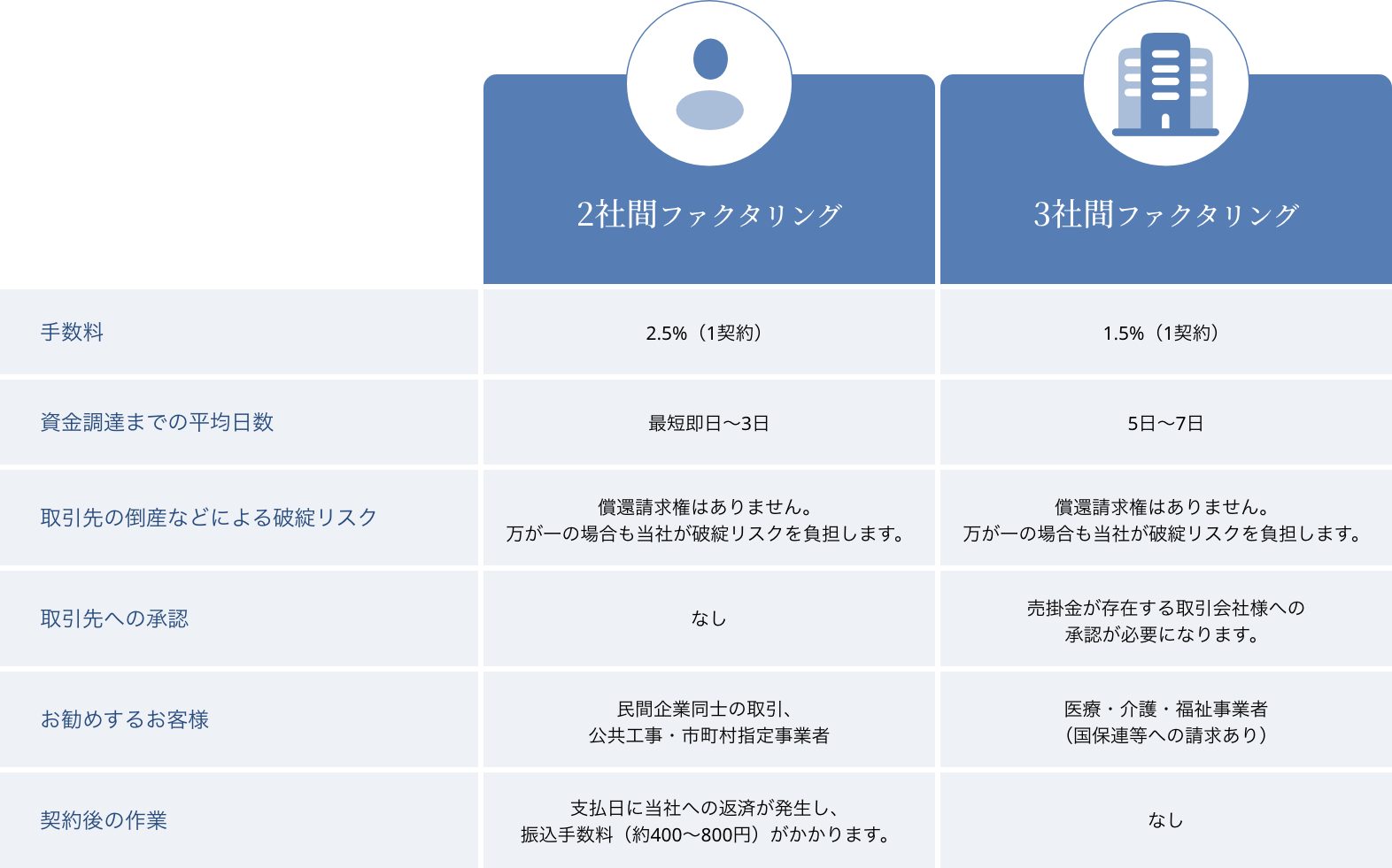当社では、2社間・3社間のファクタリングのどちらも取り扱っています。